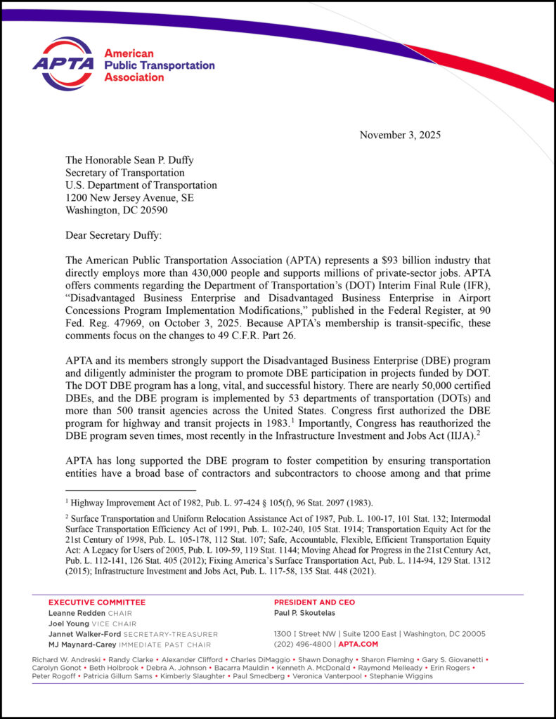 APTA wrote to U.S. Secretary of Transportation Sean Duffy, Nov. 3, offering comments regarding USDOT’s Interim Final Rule (IFR), “Disadvantaged Business Enterprise [DBE] and Disadvantaged Business Enterprise in Airport Concessions Program Implementation Modifications,” published in the Federal Register on Oct. 3.