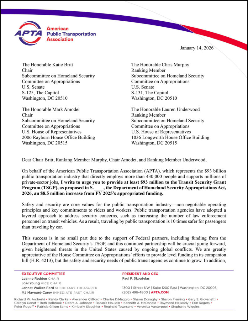 APTA sent a letter to the leadership of the House and Senate Committees on Appropriations Subcommittees on Homeland Security, Jan. 14, urging them to provide at least $93 million to the Transit Security Grant Program (TSGP) for FY26.