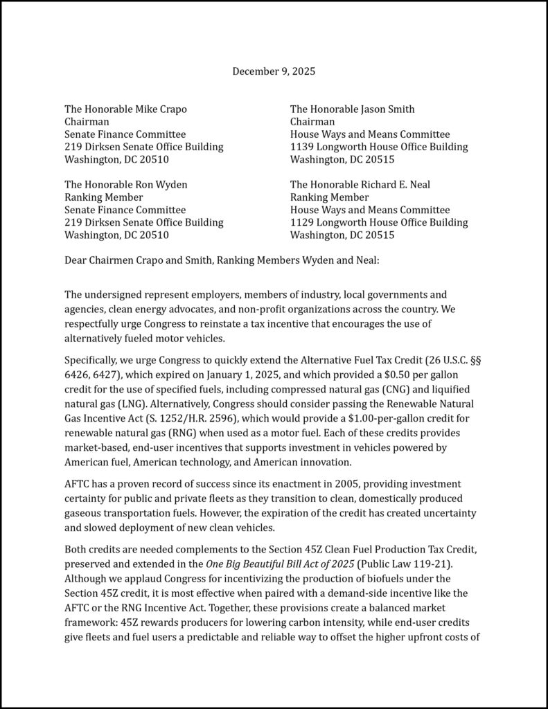 The letter also supports enacting a new credit for renewable natural gas (RNG) when used as a motor fuel.