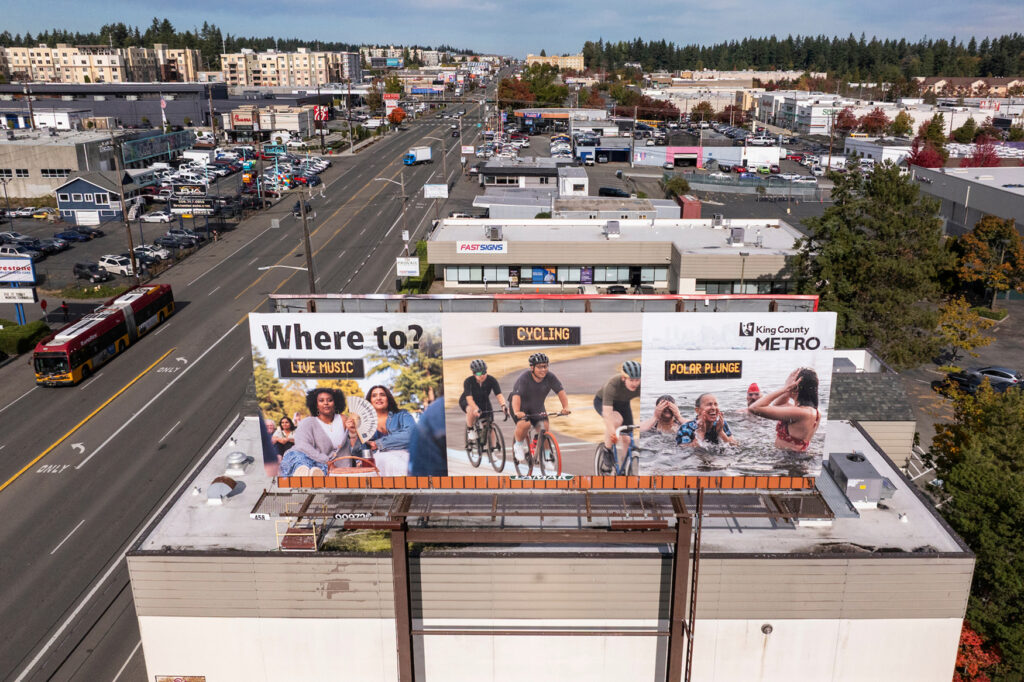 Our “Grow with Metro” and “Where to?” campaigns showed the individual aspirations behind the 1.8 million trips that Metro delivers each week. “Grow with Metro” depicted customers taking transit to try something new: adventuring outdoors, taking a pottery class, and a granddaughter and grandfather cheering on Seattle’s recently founded National Hockey League team: the Kraken. Then, in a nod to the destination signs on the front of buses, “Where to?” shows each rider’s personal destination floating above their head thanks to special effects. We see various friends uniting for bicycling, live music, and a polar plunge.