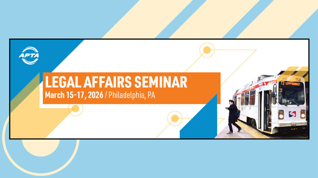 APTA is hosting its Legal Affairs Seminar for legal professionals in public transportation, March 15-17 in Philadelphia, PA. Those registering by Jan. 30 will lock in an early-bird registration discount.