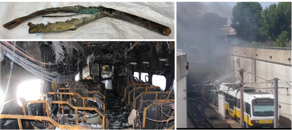 (Clockwise from upper left) Damaged third-rail feeder cable from a PATH track in Jersey City, NJ; Dallas Area Rapid Transit Train 81 in contact with a low overhead catenary wire in Dallas, TX (Source: FOX 4 Dallas-Fort Worth); and internal damage to SEPTA railcar following the Ridley Park, PA, fire.