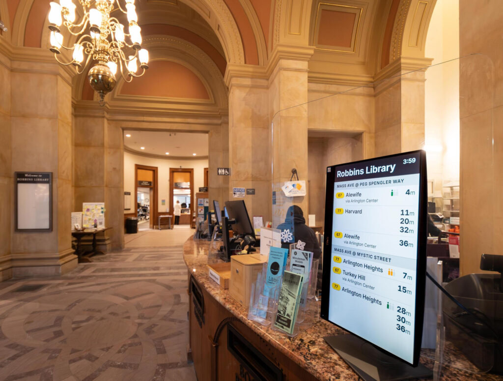 Libraries aren’t the only place where digital displays can be found. The agency moved toward digital signage in 2019, developed by the MBTA’s Technology Innovation Department using open-source software. Since then, more than 1,000 real-time displays have been installed inside and outside rapid transit stations and at bus stops across the system.