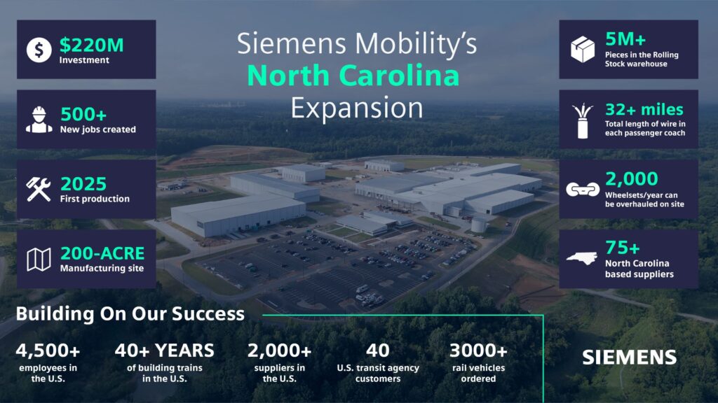 Locally, the Siemens Mobility Rail Facility will boost North Carolina’s economy by $1.6 billion over the next 12 years. The project will create jobs and grow small businesses in the state and will strengthen the skilled manufacturing base.
