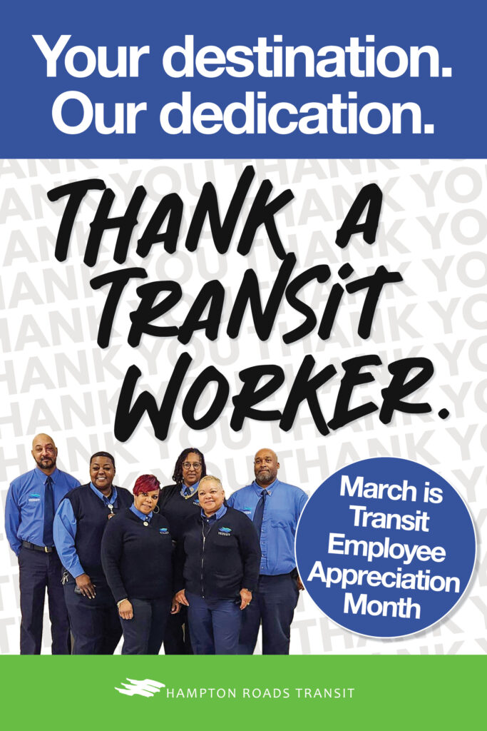 HRT, VA, is celebrating Transit Employee Appreciation Day as part of a month-long recognition of workers who keep the region moving. HRT’s governing body, the Transportation District Commission of Hampton Roads, adopted a resolution proclaiming March as Transit Employee Appreciation Month, urging Hampton Roads residents, businesses, and community organizations to recognize and express their appreciation for the hard work and dedication of transit employees. “Whether operating or maintaining a bus or light rail, assisting our passengers, or working to support our operations, their efforts are essential to the communities we serve, connecting people to jobs, education, healthcare, and essential services. The work they do has a direct impact on the lives of countless individuals and our region’s economy,” said HRT’s President and CEO William E. Harrell.